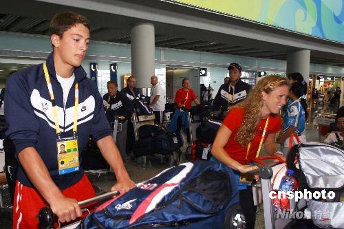 7月31日,美國奧運跳水隊抵達北京首都國際機場,隊員集結完畢后,由北京奧運會志愿者引領走出候機樓。 中新社發 劉新 攝