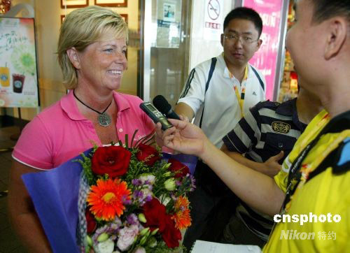 8月2日,前中國女足主教練多曼斯基(左)現身首都國際機場。她這次是作為瑞典足協官員來中國考察足球比賽場地。 中新社發 富田 攝