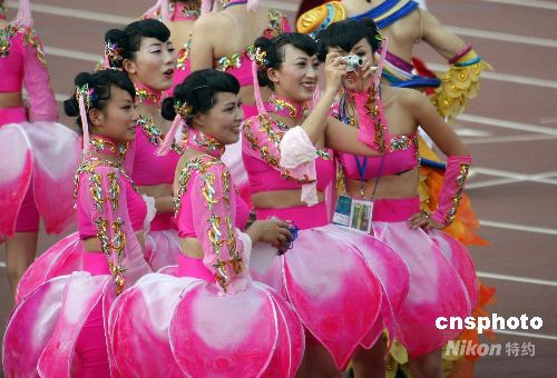 8月2日,北京奧運會開幕式彩排在“鳥巢”進行,身著亮麗“荷花服飾”的演員在場外等候入場時,互相拍照留念。 中新社發 杜洋 攝