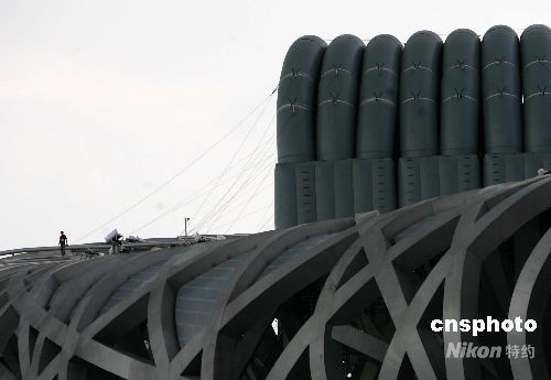 8月2日,北京奧運會開幕式第二次彩排在國家體育場“鳥巢”進行。圖為工作人員在“鳥巢”頂部布置。 中新社發(fā) 武仲林 攝
