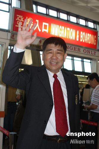 8月3日7時55分,由總領隊蔡賜爵等率領的中華臺北代表隊一行50人,搭乘華航CI603班機經香港轉機前往北京,征戰2008年北京奧運會。圖為蔡賜爵在桃園機場登機入口處,他在行前向中新社記者表示,中華臺北隊此次的目標是,最起碼要保持雅典奧運的2金2銀1銅。 中新社發 董會峰 攝
