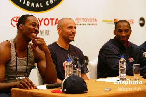 8月2日,巨星云集的美國國家男籃抵達上海,備戰即將進行的北京奧運會。他們將在滬與俄羅斯、澳大利亞男籃進行兩場比賽,為奧運熱身。當日,美國男籃主教練與部分球員出席媒體見面會,回答中外媒體提問。圖為左起德懷特·霍華德 (Dwight Howard)、賈森·基德 (Jason Kidd)、科比·布萊恩特 (Kobe Bryant)在輕松回答記者提問。中新社發 湯彥俊 攝