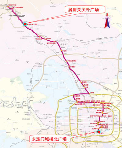 此次演練將由永定門城樓北廣場起點(diǎn)出發(fā),經(jīng)永定門北廣場、天橋南大街、天壇路、祈年大街、前門東大街、天安門廣場西側(cè)路、東長安街、南北河沿大街、平安大街、雍和宮大街、和平里西街、櫻花園西街、惠新西街、安苑路、安定路、北四環(huán)路北側(cè)主路、學(xué)院橋、北四環(huán)路北側(cè)輔路、保福寺橋、北四環(huán)路北側(cè)主路、海淀橋、頤和園路、芙蓉北路、萬泉河路、北五環(huán)路南側(cè)主路、八達(dá)嶺高速公路、小營出口、八達(dá)嶺高速公路東側(cè)輔路、昌平西關(guān)環(huán)島、八達(dá)嶺高速公路北側(cè)輔路、陳莊橋、南口東大街路口、八達(dá)嶺老路至岔道城口,沿八達(dá)嶺高速公路出京方向主路逆行至居庸關(guān)長城結(jié)束。