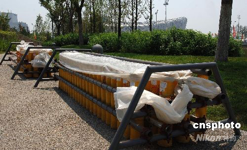 8月3日,離北京奧運(yùn)會(huì)開幕還有5天,國(guó)家主體育場(chǎng)——“鳥巢”建筑附近做好了北京奧運(yùn)會(huì)開幕式的準(zhǔn)備工作。圖為鳥巢北側(cè)布置22x4聯(lián)發(fā)禮花炮放射裝置,每一個(gè)發(fā)射裝置上均有禮花彈詳細(xì)名稱。 中新社發(fā) 鄒憲 攝