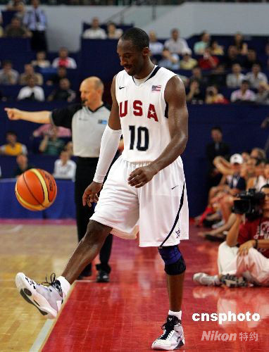 8月3日,美國男籃國際挑戰賽上海站比賽在旗忠網球中心舉行。球星云集的美國男籃最終憑借出色發揮以89比68戰勝俄羅斯隊。美國球星科比·布萊恩特 (Kobe Bryant)比賽間隙在觀眾面前大秀“腳功”。中新社發 湯彥俊 攝