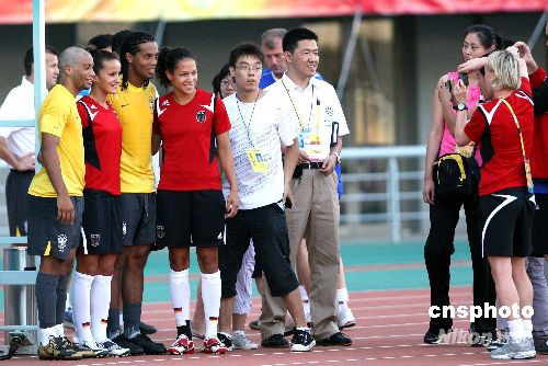 8月3日下午,參加北京奧運會足球比賽的巴西男足在沈陽首次訓練后,與前來準備訓練的德國女足隊員巧遇并合影留念。 中新社發 張宇 攝