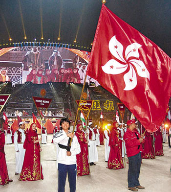 黃金寶將手持特區區旗走進北京奧運會。圖為多哈亞運會。(圖片來源:文匯報)