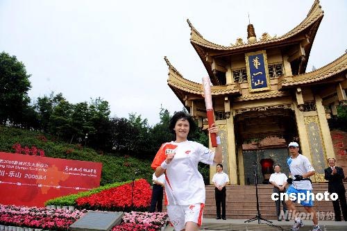 8月4日上午,北京奧運火炬開始了在四川樂山市的傳遞,這是四川省境內傳遞的第2站。首棒火炬手是兩度獲得奧運會冠軍,開創跳水界“高敏時代”的“跳水皇后”高敏。當日下午,奧運火炬將在綿陽九州體育館和廣漢三星堆進行展示。中新社發 廖攀 攝