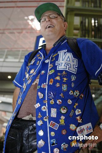 8月4日,來自美國加里福利亞的Brad Frank在北京機場展示其收集的奧運會紀念章,據其介紹,他有上萬枚紀念章,是個名副其實的奧運迷。中新社發 王東明 攝