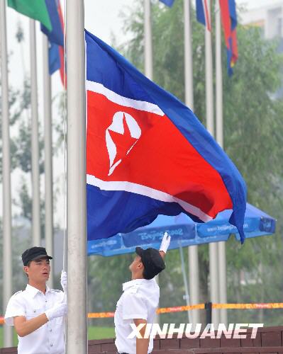 8月4日,朝鮮國旗在北京奧運村升起。當日,朝鮮奧運代表團在北京奧運村舉行升旗儀式。 新華社記者張國俊攝