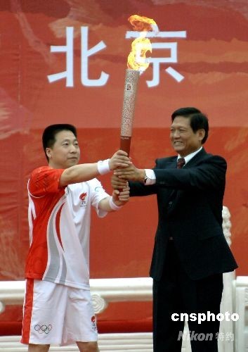 8月6日上午,北京奧運火炬傳遞在午門正式開始。圖為“航天英雄”楊利偉從北京市委書記劉淇手里接過首棒火炬。中新社發 王東明 攝