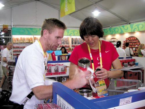 結果,廣東姑娘謝杏芳買了一大箱子的福娃茶盅,每個小小的茶盅上都有福娃頭像,一套72件。不用說,林丹提著。這下只能提前收工了,林丹迅速提了兩套福娃玩偶,還有帽子,小玩意兒,“明天再來吧。”他說。收銀臺一算:2141元。謝杏芳掏出銀行卡,不料收銀員說:“只收VISA。”喔,誰讓這里是奧運村呢。謝杏芳掏出錢包,現金沒帶夠,有點兒尷尬。這時候老帥湯仙虎上場了,他打開錢包,爽快地替弟子付了錢。此時的林丹,倒不是“不接翎子”,是真給人拖住簽名去了。