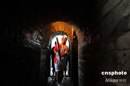 8月7日上午,奧運火炬在北京八達嶺長城傳遞,第8棒火炬手顧崇華手持燃燒的奧運火炬穿越烽火臺。 中新社發 廖攀 攝
