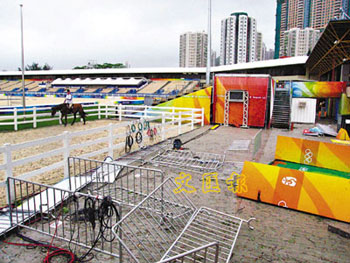 臺風“北冕”把香港奧運馬術沙田主場地旁的記者區(qū)裝飾物,吹得東倒西歪。(圖片來源:文匯報)