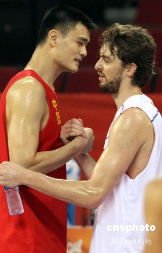 8月7日,世界冠軍西班牙男籃在北京奧運會籃球比賽館--五棵松籃球進行賽前的最后一場熱身訓練,效力于NBA洛杉磯湖人隊的超級球星保羅·加索爾(左)結束訓練后與前來訓練的中國隊超級中鋒姚明親切交談。中國與西班牙隊是同組死敵,按照實力分析中國隊擊敗世界冠軍西班牙隊的希望渺茫。 中新社發 任晨鳴