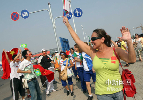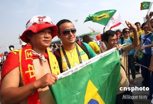 8月7日,巴西、中國(guó)球迷在北京奧運(yùn)沈陽(yáng)足球分賽場(chǎng)歡呼。當(dāng)晚,男足巴西對(duì)比利時(shí)、中國(guó)對(duì)新西蘭將進(jìn)行小組賽。中新社發(fā) 張宇 攝