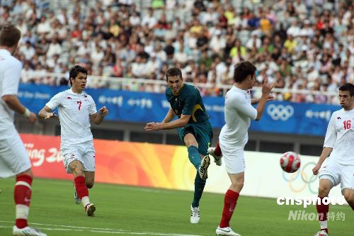 8月7日,北京奧運會男子足球預賽A組,澳大利亞對塞爾維亞的比賽在上海體育場進行。最終,澳大利亞1:1戰(zhàn)平塞爾維亞,雙方握手言和。圖為澳大利亞5號選手SPIRANOVIC Matthew在多位防守隊員包圍下起腳射門。中新社發(fā) 湯彥俊 攝