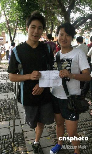 8月8日,重慶市渝中區婚姻登記處外,曾參加過中國殘疾人運動會的田徑運動員王麗娜(右)和羽毛球運動員程良華(左)正在等候辦理婚姻登記手續。 中新社發 周陽 攝