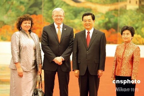8月8日中午,中國國家主席胡錦濤和夫人劉永清在北京人民大會堂為出席北京奧運會的貴賓舉行歡迎宴會。圖為胡錦濤夫婦歡迎陸克文夫婦。中新社發 任海霞 攝
