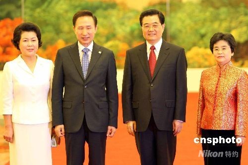 8月8日中午,中國國家主席胡錦濤和夫人劉永清在北京人民大會堂為出席北京奧運會的貴賓舉行歡迎宴會。圖為胡錦濤夫婦歡迎韓國總統(tǒng)李明博夫婦。中新社發(fā) 任海霞 攝