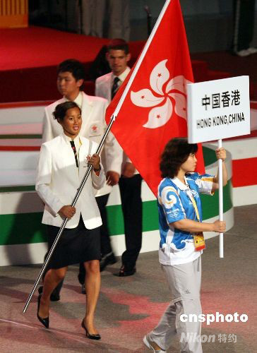 八月八日,香港特區政府在沙田賽場舉行盛大歡迎晚會上,歡迎來自世界各地參加奧運馬術比賽的參賽隊伍。圖為香港隊入場。 中新社發 洪少葵 攝