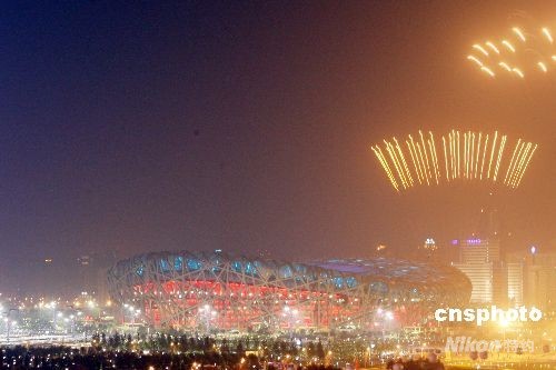 8月8日晚,第29屆奧林匹克運動會在北京開幕。象征腳印的焰火“走”進鳥巢。中新社發 毛建軍 攝