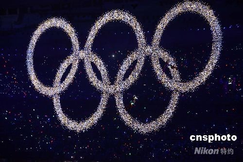 圖:開幕式五環(huán)圖案在“鳥巢”內(nèi)閃耀