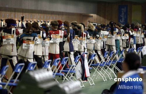8月9日,北京奧運會開賽的第一天,女子10米氣步槍資格賽率先在北京射擊館拉開戰幕。30多個國家的47名選手在17到63號靶位比試槍法,資格賽前8名進入最后決賽。按照賽程,女子氣步槍賽場極可能產生本屆奧運會的首枚金牌。圖為來自各國的女神槍手參加預賽。中新社發 盛佳鵬 攝