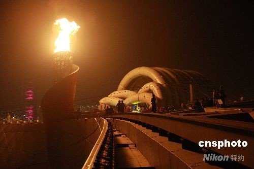 圖為7月23日深夜,鳥巢頂上的奧運火炬塔緩緩走出高度保密的氣房子,第一次被點燃,8米多高的火焰照亮了夜空。 中新社發 佟偉 攝