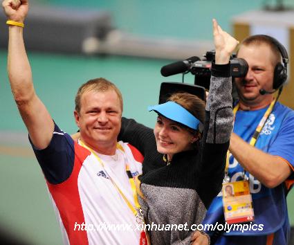 北京,2008年8月9日射擊——卡·埃蒙斯奪得北京奧運會首金 8月9日,捷克選手卡·埃蒙斯(中)與教練慶祝勝利。當日,卡·埃蒙斯以503.5環的總成績奪得北京奧運會射擊女子10米氣步槍金牌。 新華社記者李尕攝