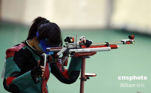 8月9日,北京奧運會開賽的第一天,女子10米氣步槍決賽在北京射擊館進行。中國選手杜麗無緣金牌,捷克選手卡特日娜·埃蒙斯獲得首枚金牌,同時也是北京奧運會產(chǎn)生的首枚金牌。中新社發(fā) 盛佳鵬 攝