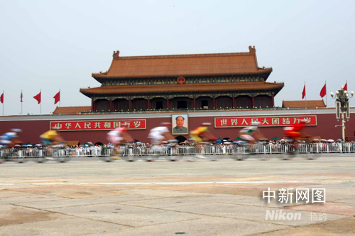 8月9日,2008北京奧運會自行車男子公路賽在永定門到居庸關248公里的賽道上舉行。圖為選手經(jīng)過天安門廣場。 中新社記者 武仲林 攝