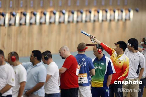 8月9日,第29屆北京奧運會射擊男子10米氣手槍資格賽在北京射擊館舉行,參賽的中國選手龐偉以資格賽頭名的成績晉級決賽,老將譚宗亮表現欠佳慘遭淘汰。圖為龐偉在比賽中。中新社發(fā) 盛佳鵬 攝
