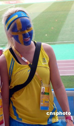 8月9日,首戰失利的瑞典女足在天津將迎來第二個對手阿根廷隊。比賽前,“全副武裝”的瑞典女球迷早早來到球場為球隊加油。中新社發 鄧霞 攝
