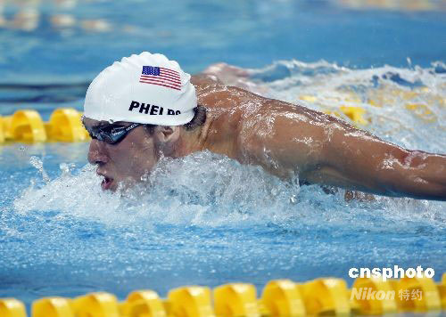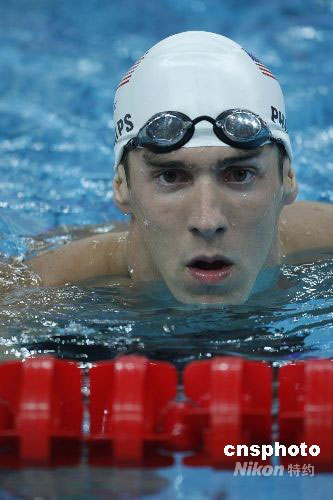 8月9日,北京奧運會游泳大戰在國家游泳中心“水立方”揭開序幕。力爭在本屆大賽奪取8枚金牌的美國游泳名將菲爾普斯在當日進行的男子400米混合泳預賽中以4分07秒82的成績打破奧運會紀錄,顯示了良好狀態。中新社發 杜洋 攝