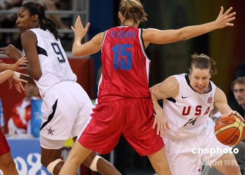 8月9日晚,雅典奧運會冠軍美國女籃在北京奧運會籃球館——五棵松體育館開始衛冕之旅,首場比賽以97比57擊敗捷克隊。圖為美國隊超級球星9號萊斯麗,利用檔拆戰術協助14號后衛史密斯突破捷克隊防線。 中新社發 任晨鳴 攝
