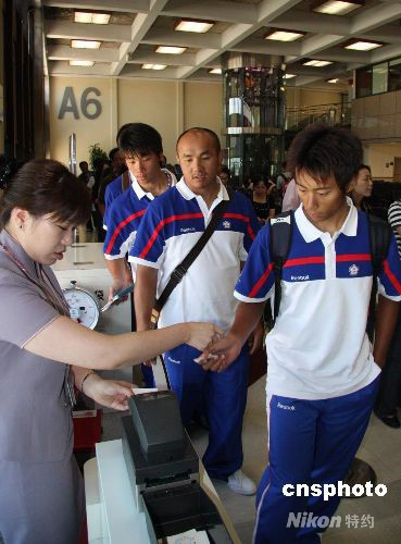 中華臺北棒球隊三十人于八月十日上午十時四十分,乘班機離臺赴北京參加奧運會。圖為隊員在登機口驗票。 中新社發(fā) 曾嘉 攝