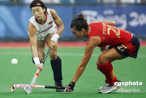 8月10日,中國女曲在北京奧運會女子曲棍球小組賽首場比賽中以3:0戰勝西班牙隊。圖為雙方球員展開激烈爭奪。中新社發 武仲林 攝