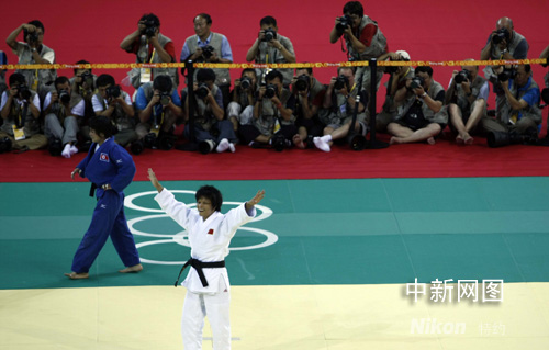 中新社北京八月十日電 (記者 王歡)以凌厲快速的出擊將朝鮮“黑馬”安琴愛(ài)摔倒在地,廣東名將冼東妹今天登上了北京奧運(yùn)會(huì)女子柔道五十二公斤級(jí)的冠軍領(lǐng)獎(jiǎng)臺(tái),不僅奪取了中國(guó)軍團(tuán)京奧第五金,而且再度創(chuàng)造歷史,成為中國(guó)第一個(gè)兩奪奧運(yùn)金牌的柔道高手,更是中國(guó)首位“媽媽級(jí)”奧運(yùn)冠軍。