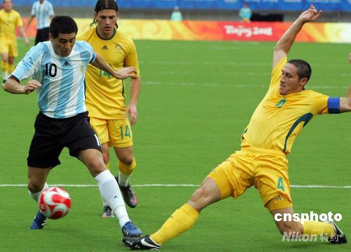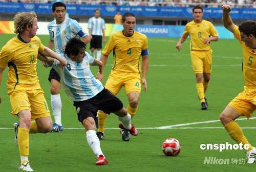 8月10日,北京奧運會上海足球分賽場男足小組賽A組第二輪,阿根廷VS澳大利亞的比賽在上海體育場進行,最終,阿根廷隊以1:0戰勝澳大利亞迎來二連勝,率先從小組出線。 中新社發 湯彥俊 攝