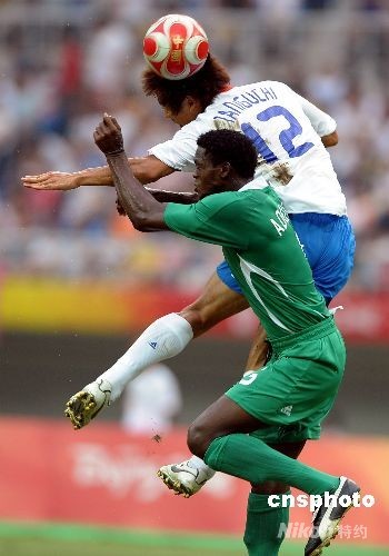 8月10日下午,在奧運男足小組賽天津賽區(qū),日本男足0:2不敵尼日利亞隊。圖為日本隊12號谷口博之在爭頂。中新社發(fā) 陳文 攝