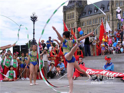 接下來的文藝演出精彩紛呈,加拿大朋友表演獨唱、合唱和民族舞蹈,尤其是武術表演更受到大家的歡迎。來自杭州青少年文化中心藝術體操隊的小演員們則表演了精彩的藝術體操。