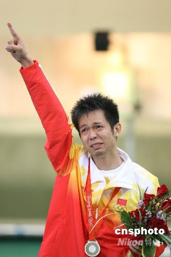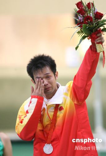 8月11日,中國選手朱啟南在北京奧運會男子10米氣步槍決賽中以699.7環的成績奪得銀牌,印度選手賓德拉奪得冠軍。圖為朱啟南在領獎臺上眼泛淚光。中新社發 武仲林 攝