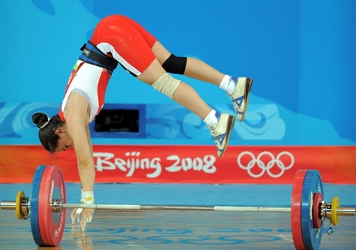 8月11日,阿爾巴尼亞選手羅梅拉·貝加伊試舉成功后興奮地翻起筋斗。當日,北京奧運會舉重女子58公斤級決賽在北京航空航天大學體育館舉行。
