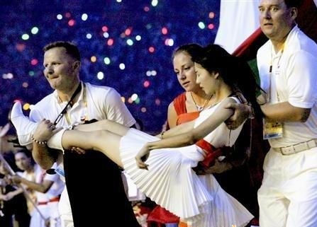 值得一提的是,當晚,有位白衣姑娘因透支體力而昏厥。在網上,一張照片記錄了這一幕:一位白衣MM不省人事,左手因抽筋痙攣而僵硬。讓人感動的是,這位姑娘暈倒在地后,第一時間抱起她的,是一位美麗的外國女運動員,兩旁還有兩位身穿白衣的外籍工作人員,一人托住她的腳,一人扶住她的頭,面露焦急,奔跑著,將姑娘送下場。這一幕,感動了無數網友,紛紛感謝這3位外國友人的熱心,并急切地搜索著他們的資料。“真誠的國際友誼啊!為這樣的和諧、友好鼓掌!”有網友在網上發了無數個“謝謝”來表達無法表達的謝意。