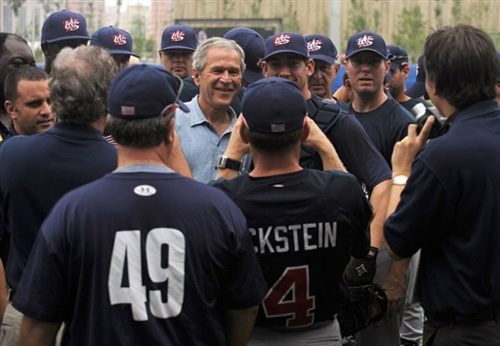 8月11日,美國總統布什現身五棵松棒球場,親自上陣秀球技,并與美國棒球隊運動員交談并合影留念。
