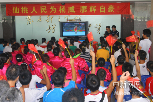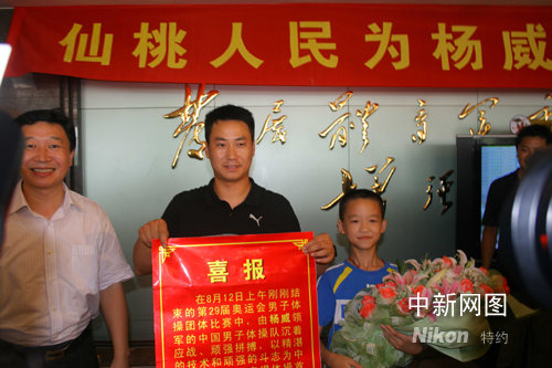 8月12日,楊威率領中國體操男隊奪得奧運會團體金牌。當日中午時分,當消息傳到楊威家鄉中國體操之鄉湖北仙桃市,早早守侯在電視機前的當地官員、民眾一片沸騰,人們敲鑼打鼓、齊鳴鞭炮,熱烈慶賀仙桃籍運動員楊威再次獲得奧運會體操男團冠軍。