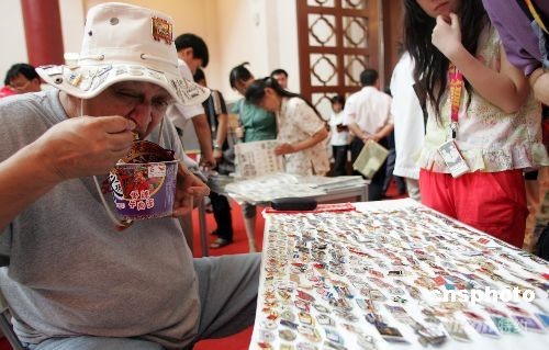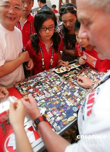 8月12日,眾多“國際級”紀念章收藏者在北京奧林匹克博覽會上擺攤兒,與前來歡享北京奧運會的世界各地體育迷交換體育紀念章。象征著友誼的紀念章在奧林匹克的節日里——只換,不賣。中新社發 楊可佳 攝