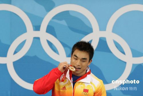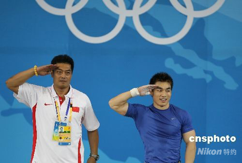 8月12日,中國選手廖輝在北京奧運會男子舉重69公斤級比賽中以348公斤的總成績奪得冠軍。在賽后進行的頒獎儀式上,獲得冠軍的中國小將廖輝一出場就博得了現場觀眾的陣陣掌聲,最終站上領獎臺的八一小將也再次以一個軍禮回敬了主場觀眾的支持。 中新社發 武仲林 攝