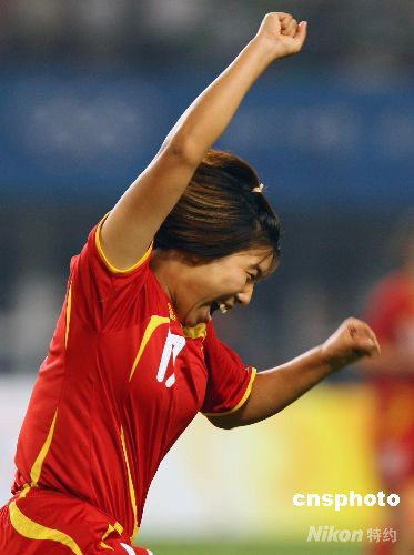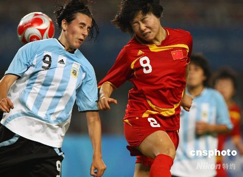 8月12日,北京奧運會女足預賽,中國對阿根廷的比賽在秦皇島奧體中心舉行,中國女足以2:0戰勝阿根廷女足,以小組第一身份出線。中新社發 劉新 攝